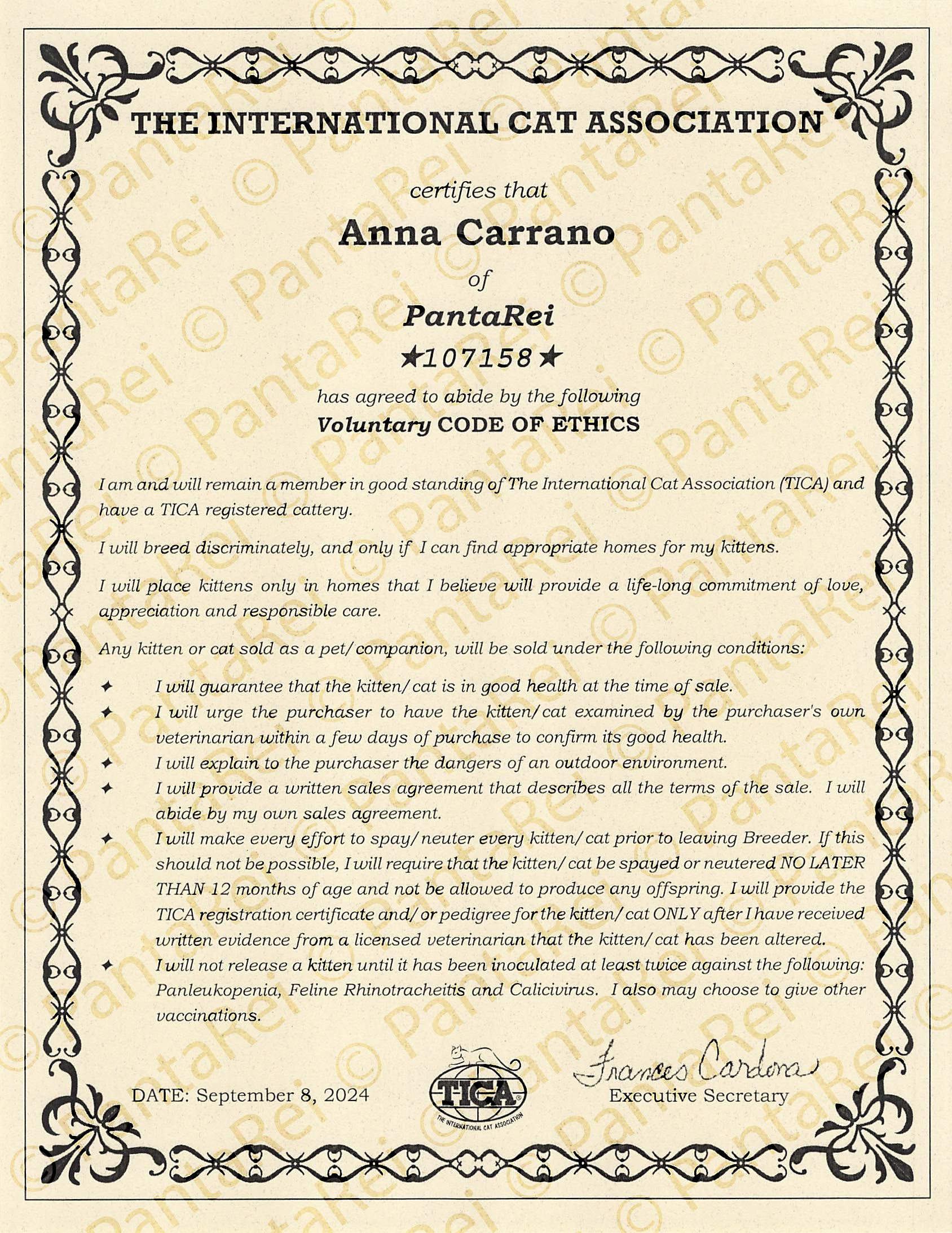 PantaRei abides by the TICA Voluntary CODE of ETHICS.